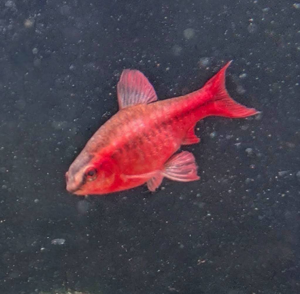 この水槽の人気者は、全身が美しい赤色に染まったレッドチェリーバルブ