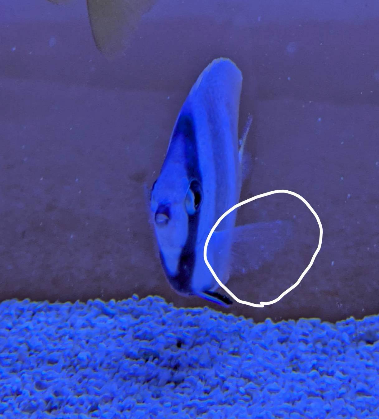 「もしかして…」と思い、注意深く観察してみると、胸ビレ付近に小さな白い点が確認できました。